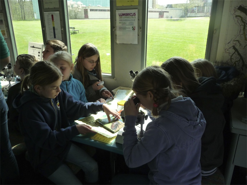Die Schüler/innen der Klasse 5 b haben das vielfältige Leben im Waldboden des Boniburger Waldes erforscht. Dazu wurde ein Bodenprofil erstellt und viele eher unbekannte Tiere im Waldboden wurden entdeckt. Diese Tiere konnten dann im Umweltbus untersucht und bestimmt und im Anschluss den Mitschüler/innen präsentiert werden.
