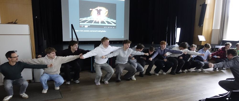 Mit großer Freude durften wir an unserer Schule Ende November einen besonderen Gast in der Aula begrüßen: Kai Schmitz, Professor für theoretische Physik an der Universität Münster, der die Physikkurse der EF und Q1 in einem lebendigen Vortrag tief in sein faszinierendes Forschungsgebiet der Gravitationswellen eintauchen ließ.Der Vortrag vor ca. 60 Zuhörerenden begann auf ungewöhnliche Weise: Professor Schmitz bat die erste Zuschauerreihe nach vorne zu kommen und ließ sie auf seine Regie hin eine kleine Choreografie aufführen, die anschaulich zeigte, wie eine Gravitationswelle durch das Publikum läuft. Diese lebendige Darstellung half allen Zuhörenden, ein anschauliches Verständnis für das unsichtbare Phänomen zu entwickeln, das Raum und Zeit selbst beeinflusst.
