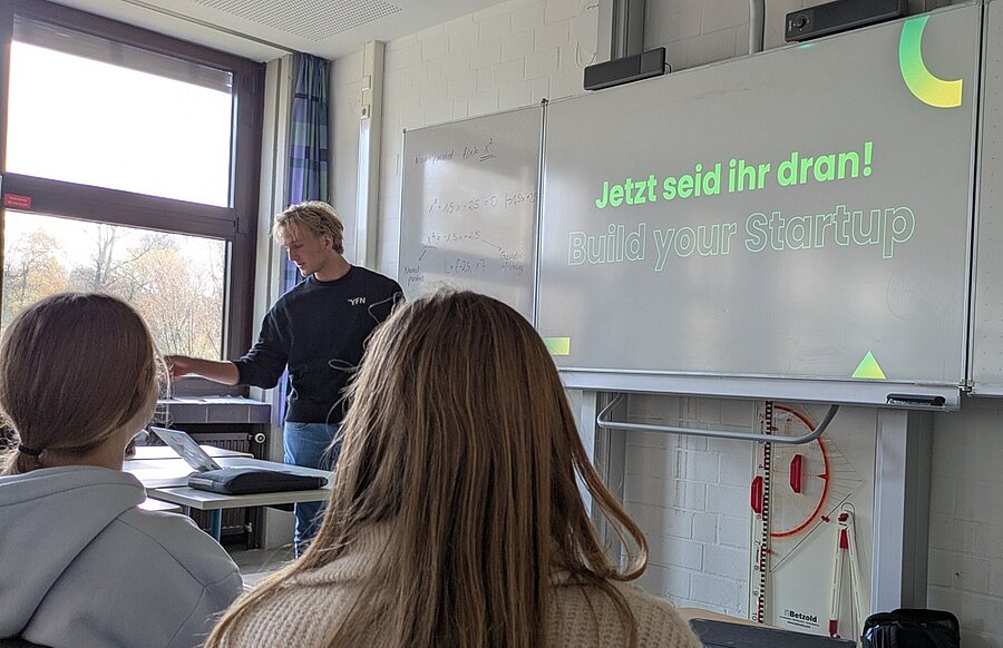 Anlässlich der bundesweiten Gründungswoche „start up in school“ vom 17. bis zum 21.11.25 hatten sich die 10. Klassen im Fach Wirtschaft-Politik (WiPo) einen echten Gründer als Experten eingeladen: Tjark Bauer, 20 Jahre alt und BWL-Student an der Uni Münster. In seinem jungen Alter hat Herr Bauer schon in der Schule und neben seinem Studium zwei Startups gegründet: im Alter von 16 Jahren gründete er eine Agentur für Social Media Marketing für Firmen und erst vor Kurzem eröffnete er eine Firma, die mit Hilfe von KI Webseiten von Rechtsanwälten aktualisiert und optimiert (kanzleiblogs.de). Im Rahmen einer Doppelstunde informierte Tjark Bauer als Mitglied des gemeinnützigen „Young Founders Network“ (YFN) die Schülerinnen und Schüler der 10. Klassen über viele Fragen zur Gründung eines Unternehmens: Problemlösungsfähigkeit, Risikoanalyse, Rechtsformen, Marketingkonzept und Businessplan waren nur einige Themen, die auf dem Business-Stundenplan standen. In einem echten „Pitch“, einer nur 2-minütigen Kurzvorstellung, hatten die Zehntklässlerinnen und Zehntklässler die Aufgabe, ein fiktives Unternehmen vorzustellen und für potenzielle Investoren schmackhaft zu machen. Am Ende musste Herr Bauer noch viele Fragen zu Startups und Gründungen beantworten, denn im Rahmen der Unterrichtsreihe „Startups und Existenzgründungen“ gründen alle drei 10. Klassen in Kleingruppen eigene fiktive Firmen, die im Rahmen eines „Pitches“ im Unterricht präsentiert werden.